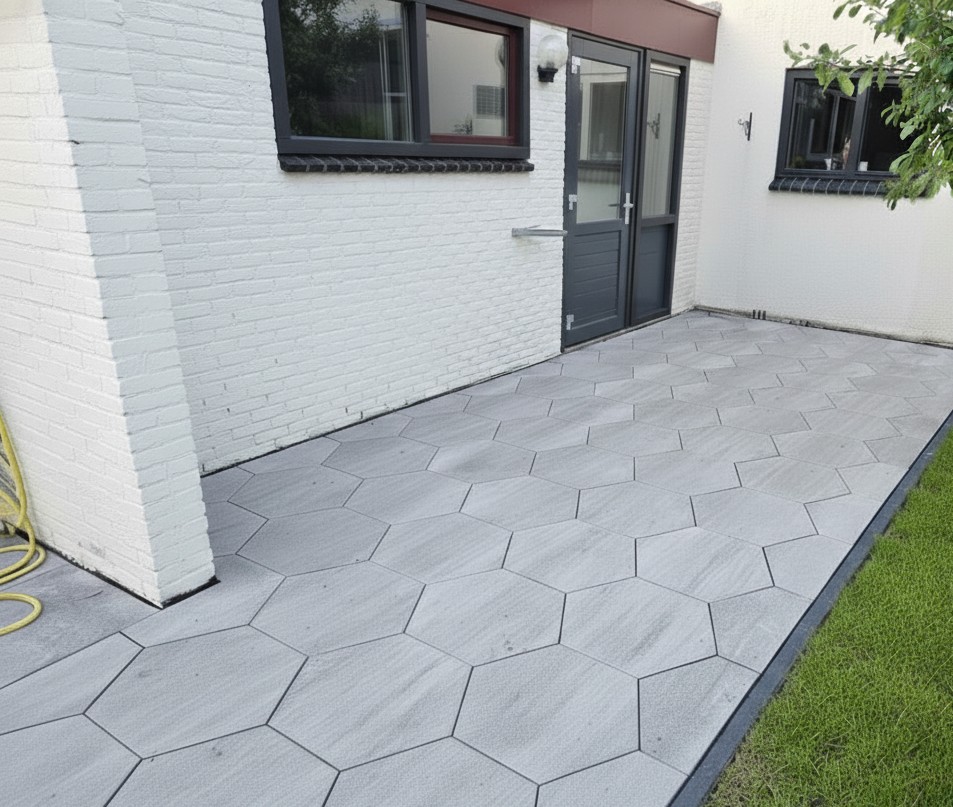 een stijlvolle zeshoekige tegel met een zachte toplaag en moderne uitstraling, perfect voor een speelse en luxe tuininrichting.